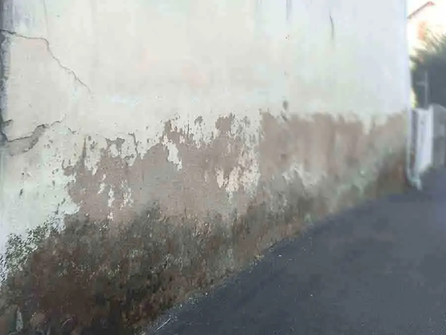 Le mur absorbe l'humidité du sol par manque ou défaillance de barrière étanche. Cette rupture d’étanchéité permet à l’eau de s’infiltrer dans les murs, ici un traitement par séchage sera préconisé. Un asséchement chimique qui aura pour objet de recréer une barrière étanche.