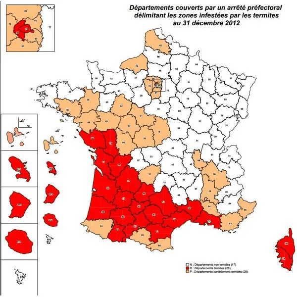 Termites : Carte des départements couverts par un arrêté préfectoral.