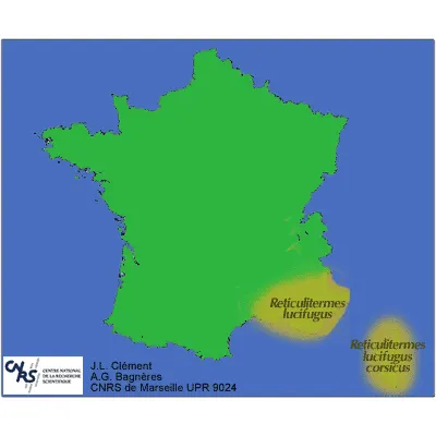Carte de la répartition des termites : Reticulitermes Lucifuge et Reticulitermes Lucifuge Corsicus en France.