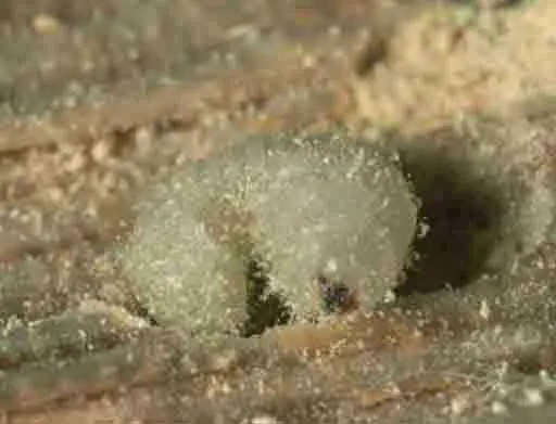 La taille de la larve de la petite vrillette est de 5 à 7 mm.Thorax en forme de capuchon.La couleur de la larve de la petite vrillette est blanche à blanche-crème.La forme de la larve de la petite vrillette est arquée avec une faible pilosité.La durée du développement des larves de petites vrillettes est de 1 à 4 ans et peut être fortement raccourci si le bois subit une attaque de champignons lignivores.L'émergence des larve de petite vrillette se situe du mois de Mai à Septembre.